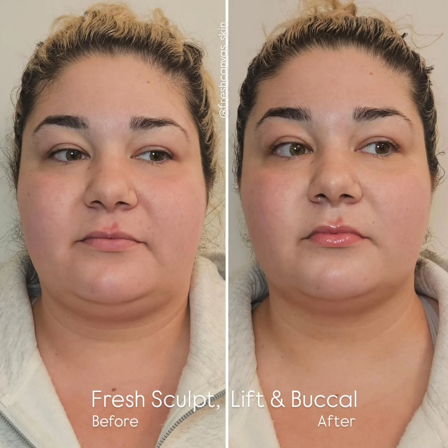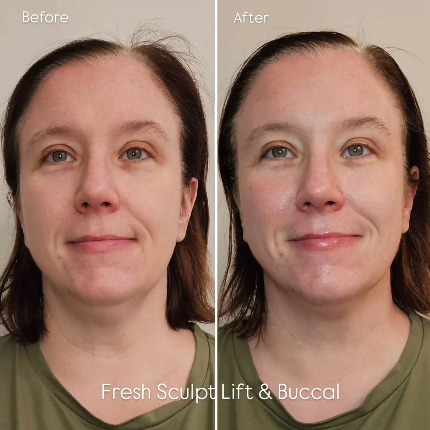 Side-by-side comparison photo of a woman  showing her face before and after Fresh Sculpt, Lift & Buccal treatment, with lifted, smoother skin in the after photo.