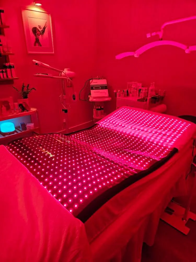 Full body LED Red & Infrared Therapy: Deepen your facial experience with this full-body LED red + infrared light therapy mat. This add-on promotes muscle relaxation, improves circulation, and supports deep cellular recovery—all while enhancing the results of your skincare treatment.